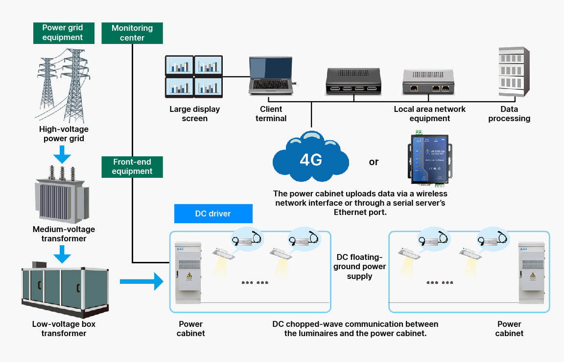The DC power system converts 380V AC mains power into a centralized, regulated 200–300V low-voltage DC supply. Through high-efficiency DC-DC conversion, it minimizes energy loss, achieving an overall system efficiency exceeding 92%. The innovative DC carrier dimming technology enables signal transmission directly through power cables, eliminating the need for additional control wiring and further enhancing energy efficiency. The floating DC power supply and insulation monitoring technologies fundamentally reduce the risk of electric shock while providing real-time safety alerts. The management platform supports automatic dimming and multi-scenario customization, allowing one-click switching between different lighting zones to achieve refined management and efficient operations.