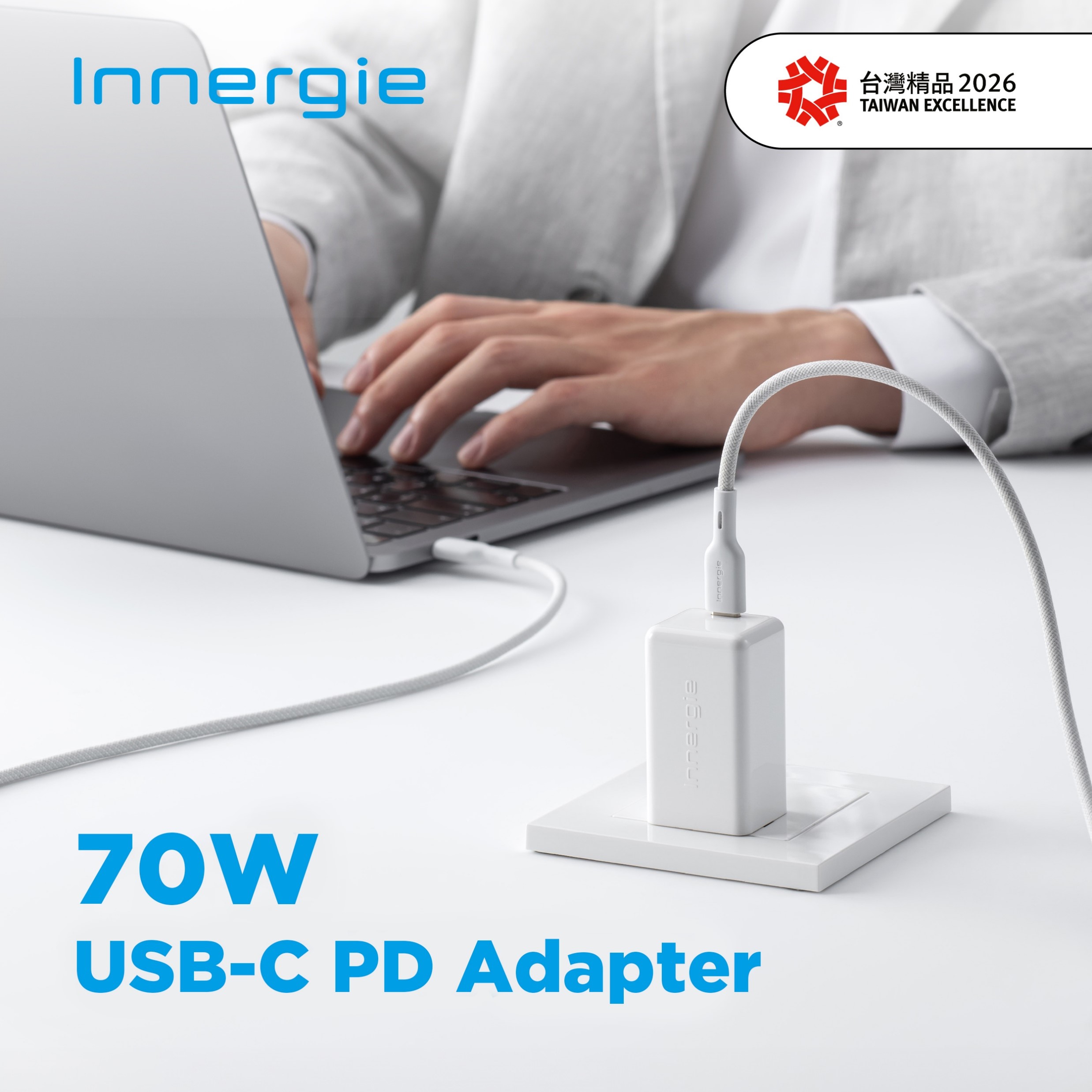 The Innergie 70W PD Adapter was also recognized with a Taiwan Excellence Award for its compact 47cc size and PD charging, optimized for daily commuting and travel.