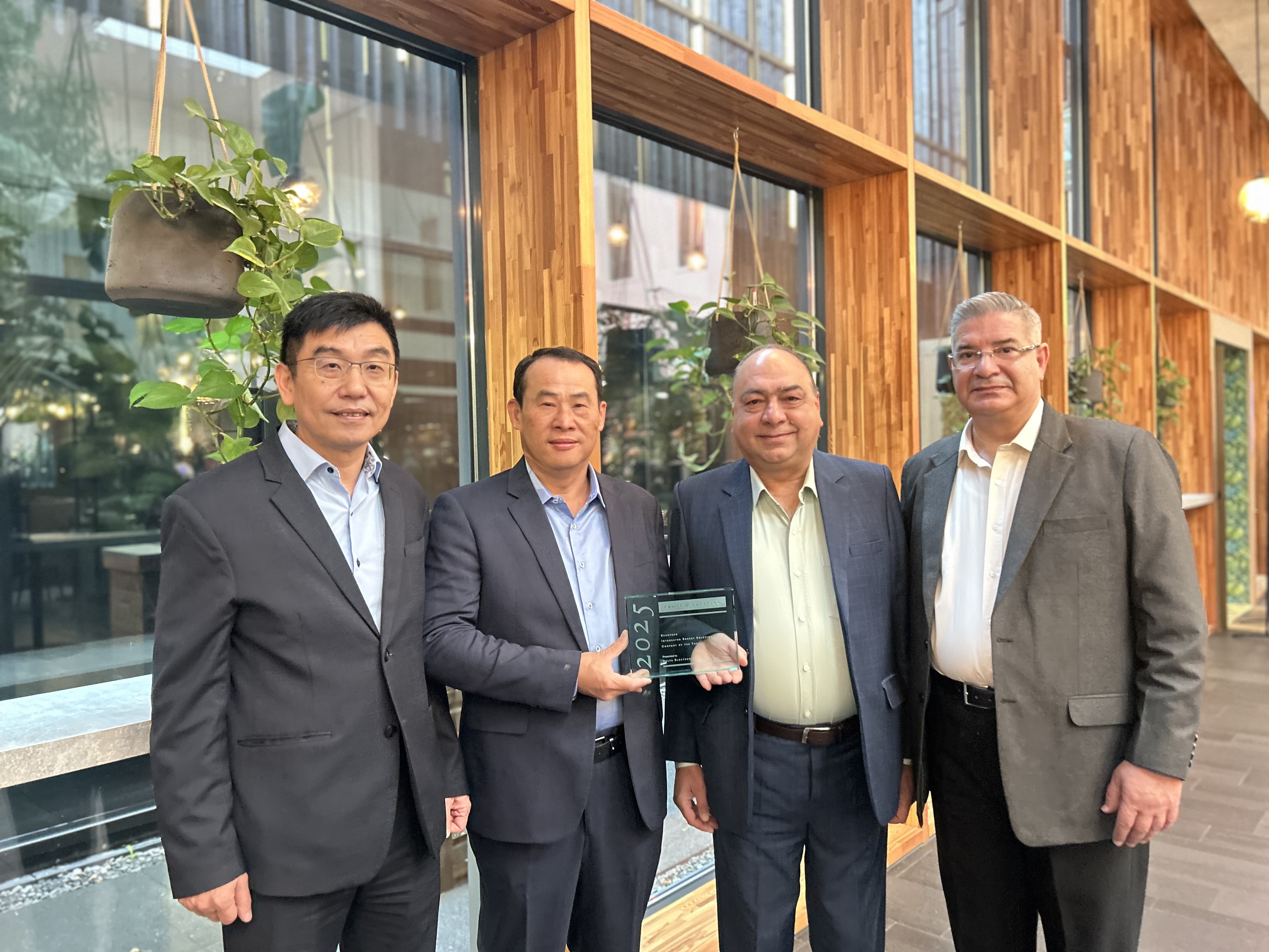 台達主管與2025 年 Frost & Sullivan 歐洲年度企業獎獎盃合影(由左至右: 台達能源基礎設施暨電力事業群副總裁暨總經理李延庭, 台達能源基礎設施暨電力事業群副總經理徐瑞源, 台達EMEA能源基礎設施暨電力事業群主管 Rakesh Mukhija, 以及台達EMEA總裁 Dalip Sharma)