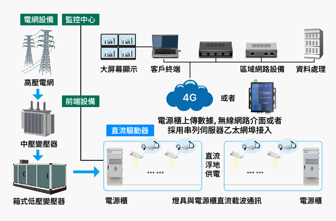 直流電源系統將380V交流市電集中整流、穩壓為200~300V低壓直流電,透過高效DC-DC轉換減少能耗損失,整體綜合效率高達92%以上。創新的直流載波調光技術,通過動力電纜直流載波,不用額外拉信號控制線,進一步提升節能效果。懸浮直流與絕緣監測技術從根本上降低觸電風險,並提供即時預警保障安全。管理平台支持自動調光與多場景定制,一鍵切換不同區域照明,實現精細化管理和高效運營。