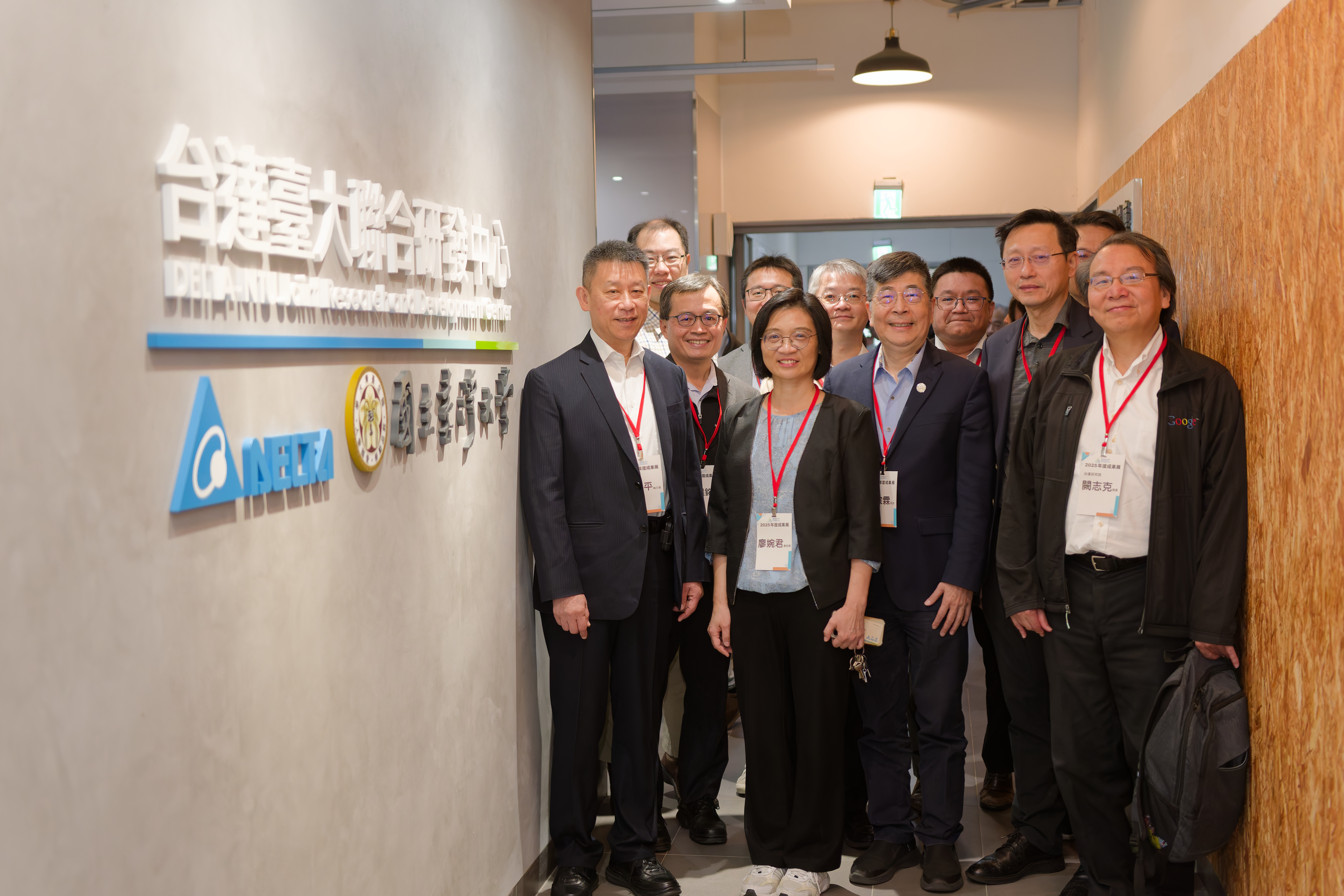 台達董事長鄭平與台大廖婉君副校長、電資學院吳宗霖院長、中心主任陳耀銘老師及台達同仁在聯合研發中心合影