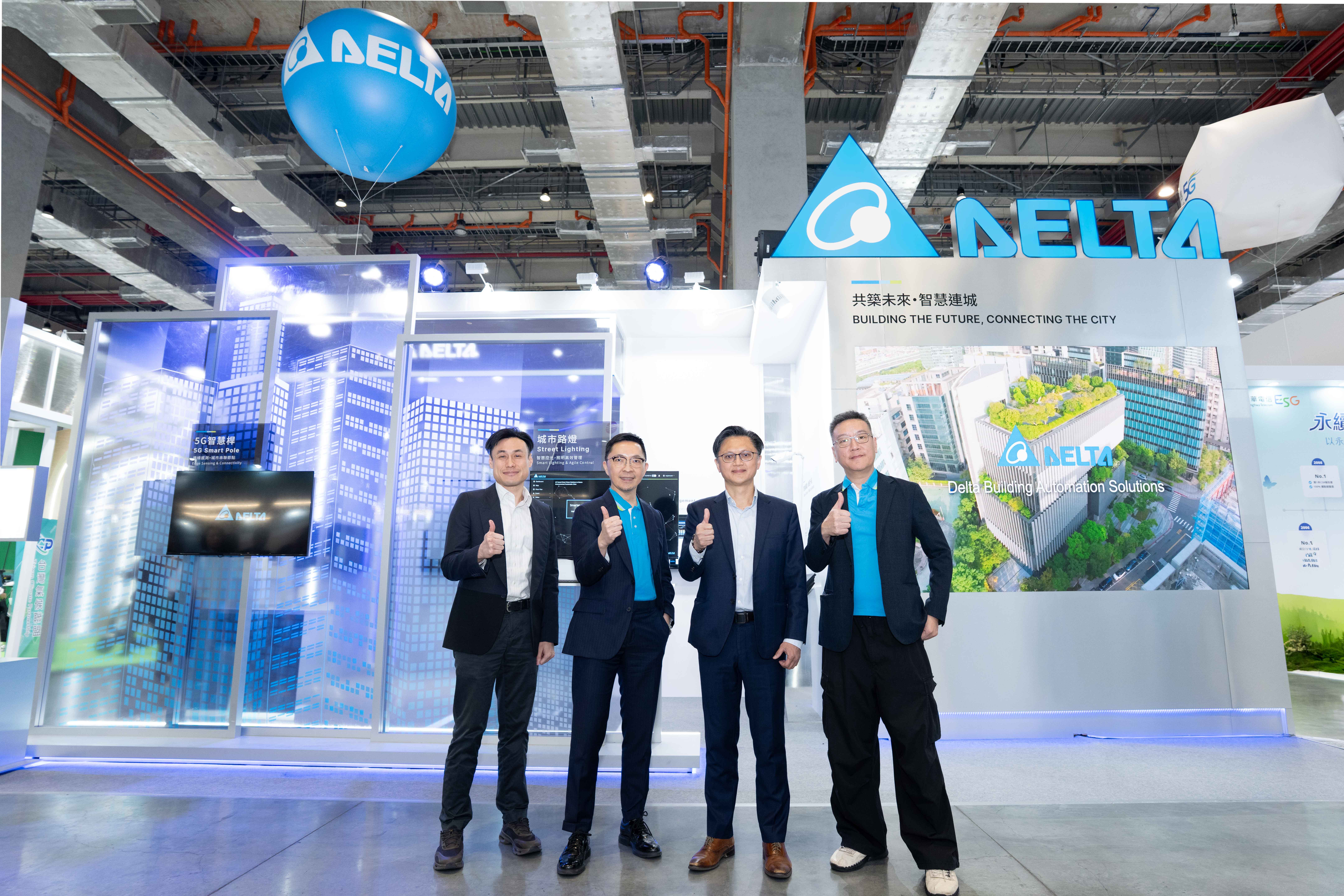 (由右至左) 台達智慧園區解決方案事業部經理李同捷、台達智慧園區解決方案事業部處長蘇文杰、台達ESG整合策劃辦公室資深處長李立仁、台達品牌暨企業信息處資深經理施孟璁出席台北智慧城市展