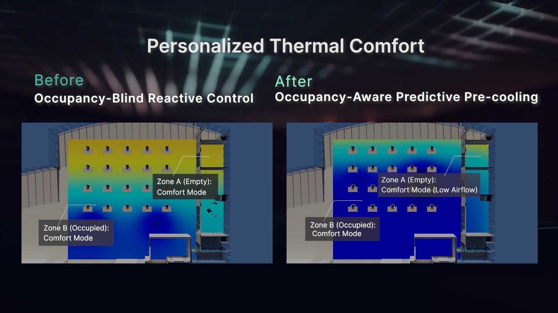 本次展覽的技術亮點在於iCMS應用了NVIDIA Omniverse™數位雙生 (Digital Twin) 技術。透過高擬真的3D視覺化環境進行物理模擬預測,系統能即時掌握環境變動對能耗的影響。