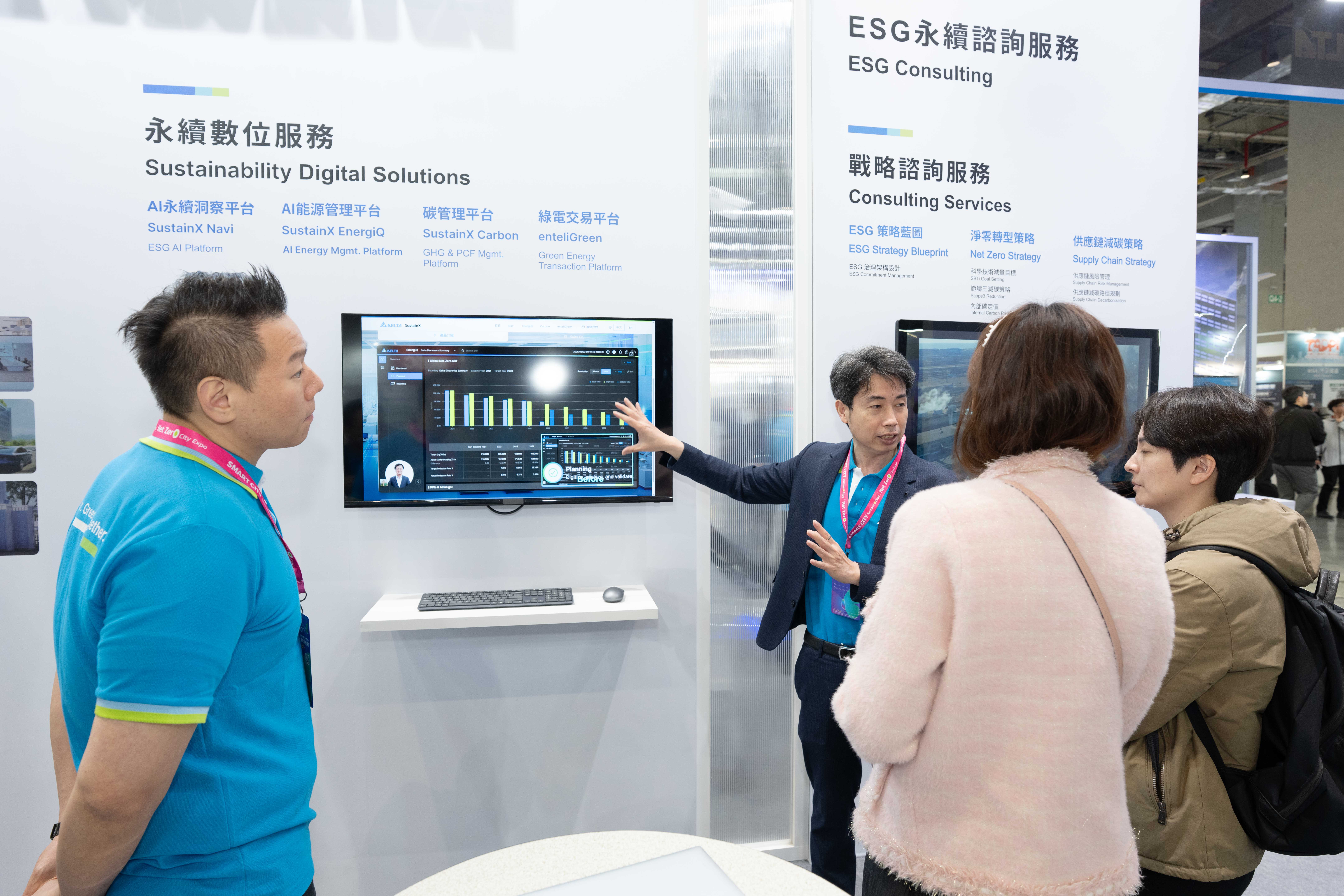 除了運用數位雙生強化廠辦維運效率,台達亦將內部的淨零轉型經驗系統化,提供專業的ESG諮詢服務。該服務旨在協助企業加速淨零進程,從戰略端的永續藍圖規劃,到營運端利用SustainX數位套件 (如EnergiQ能源管理、Carbon碳管理工具) 提升盤查效率。最後將台達節能方案模組化,提供節能評估與成效監測,確保工商廠辦客戶的減碳目標能具體落實為可交付的工程成果。