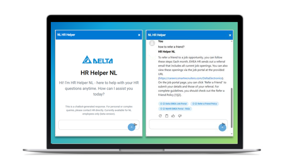 荷蘭台達推出的 NL HR Helper 為一款智能人資聊天機器人,協助員工快速查詢訓練、績效、招募與員工權益等相關資訊