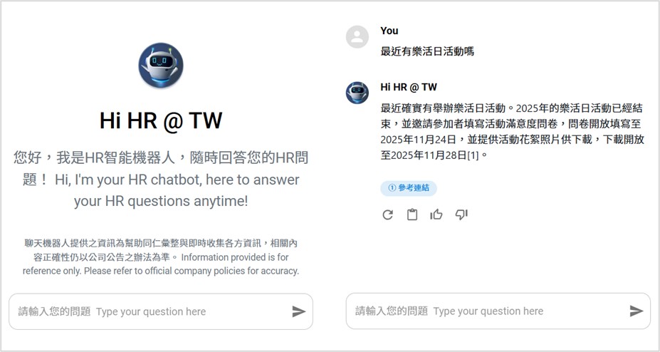 Hi HR機器人整合內部人資網站、DMS學習平台資訊,即時以AI應用方式回答福利、健康管理、學習發展、人資辦法等相關問題,提供清晰、具參考來源的解答,亦同時能自動切換多語系與進行多個問答,此機器人有如好夥伴一般,即時回覆員工一般問題,減少人資團隊重複性與庶務性業務,並使團隊更有有效投入核心策略業務與進行員工關懷。