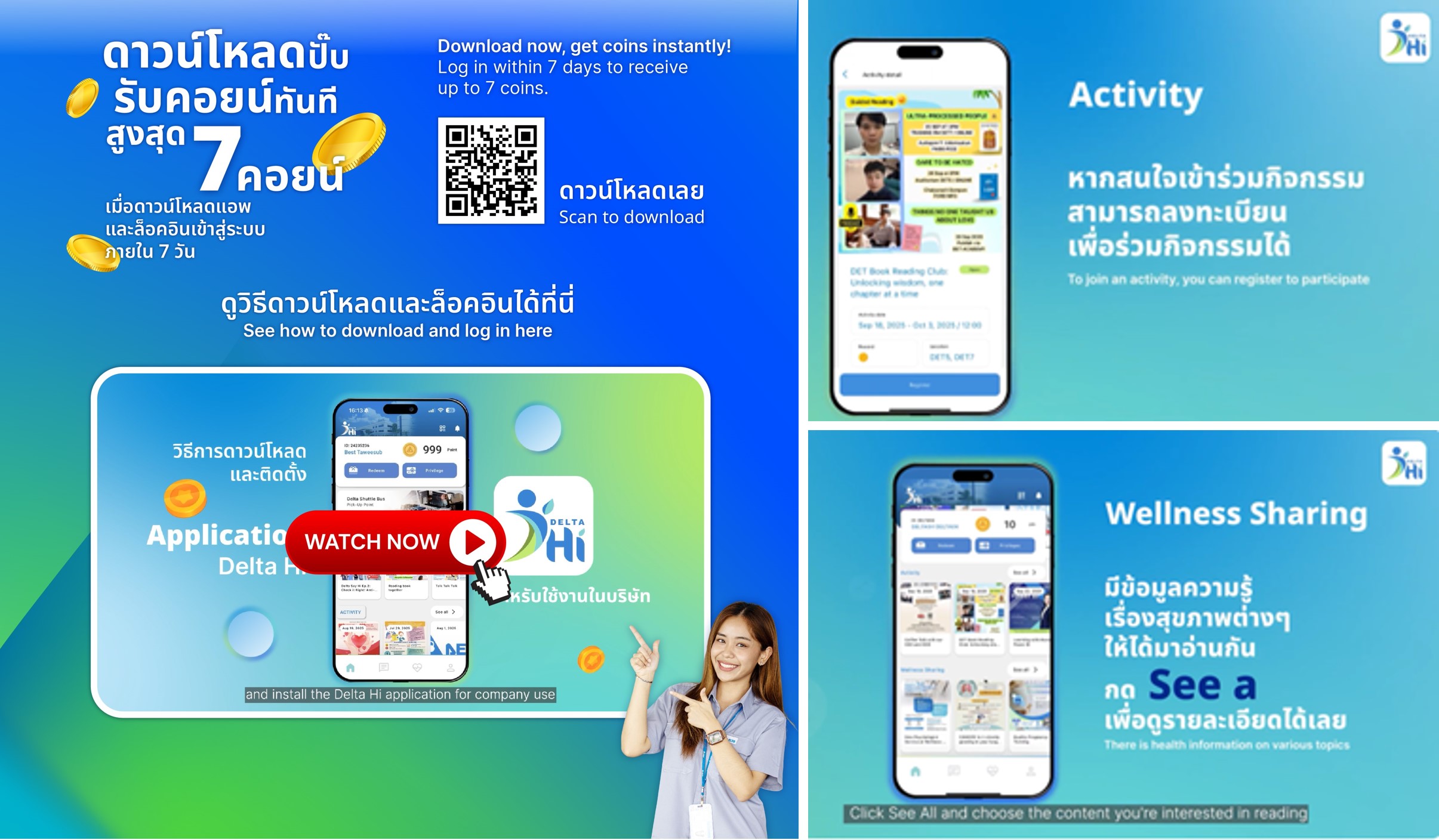 泰國台達的Delta Hi行動應用程式提供整合性與即時性的員工福利、學習、健康等資訊,員工可透過此app報名、報到活動、預約看診等,並於下載此app與報名活動的過程中獲得積分