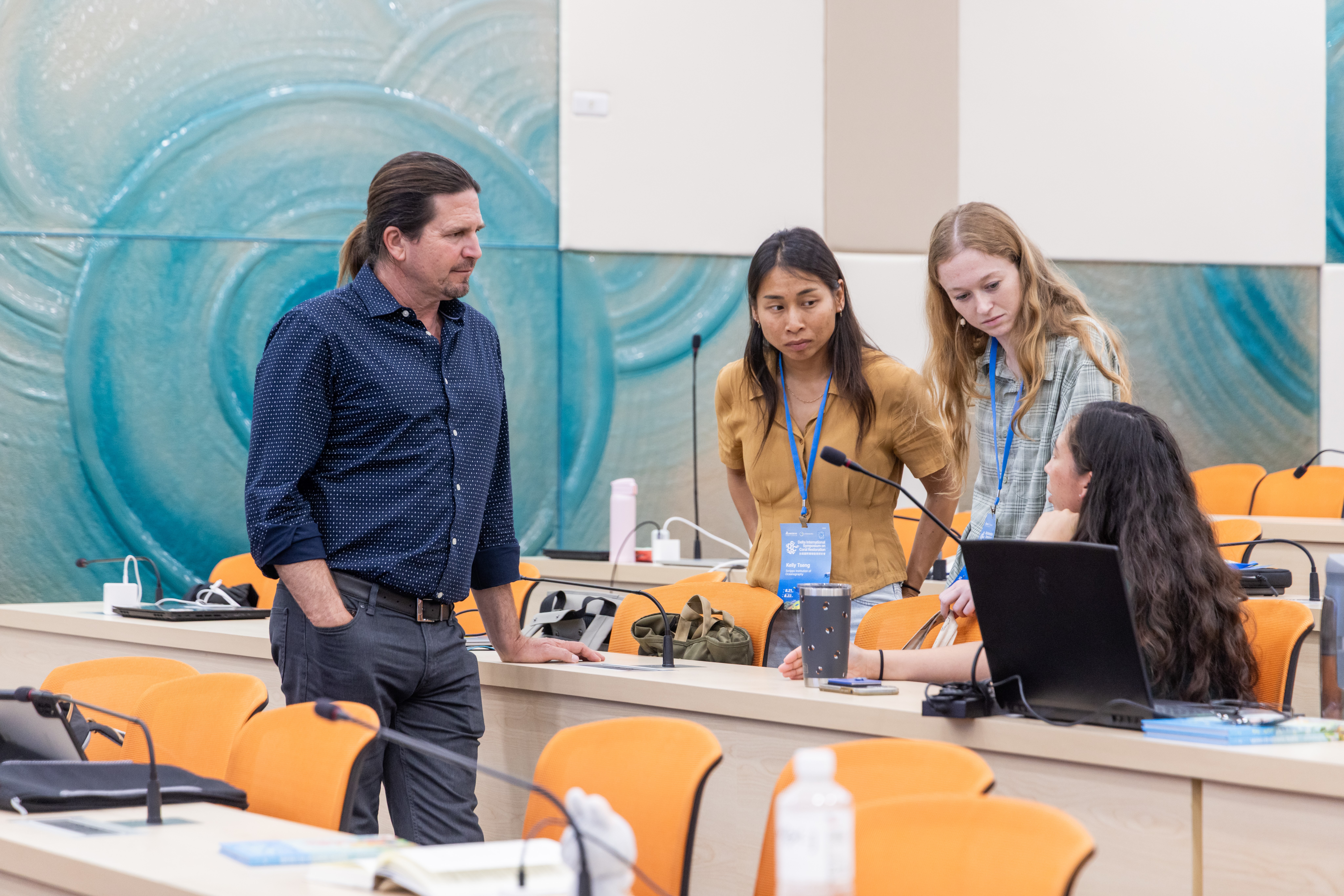研討會第一天的主題演講中,全球領先的珊瑚礁研究機構——美國加州大學聖地牙哥分校Scripps海洋研究所的Stuart Sandin博士,介紹了大面積成像(Large-Area Imaging)技術如何蒐集影像,並建置3D數位孿生模型,以便有效追蹤珊瑚生態變化。與台達基金會共同出席2024年生物多樣性公約會議的美國Mote海洋實驗室Jason Spadaro博士指出,AI技術可輔助珊瑚調查,評估棲地珊瑚覆蓋率與移植適宜性。他並表示,透過此次研討會,發現佛羅里達與台灣的珊瑚復育情境有許多相似之處,將把會議中激發的想法帶回實驗室分享。研討會中場,UCSD海洋生態學家Stuart Sandin博士(左一)與團隊分享交流意見