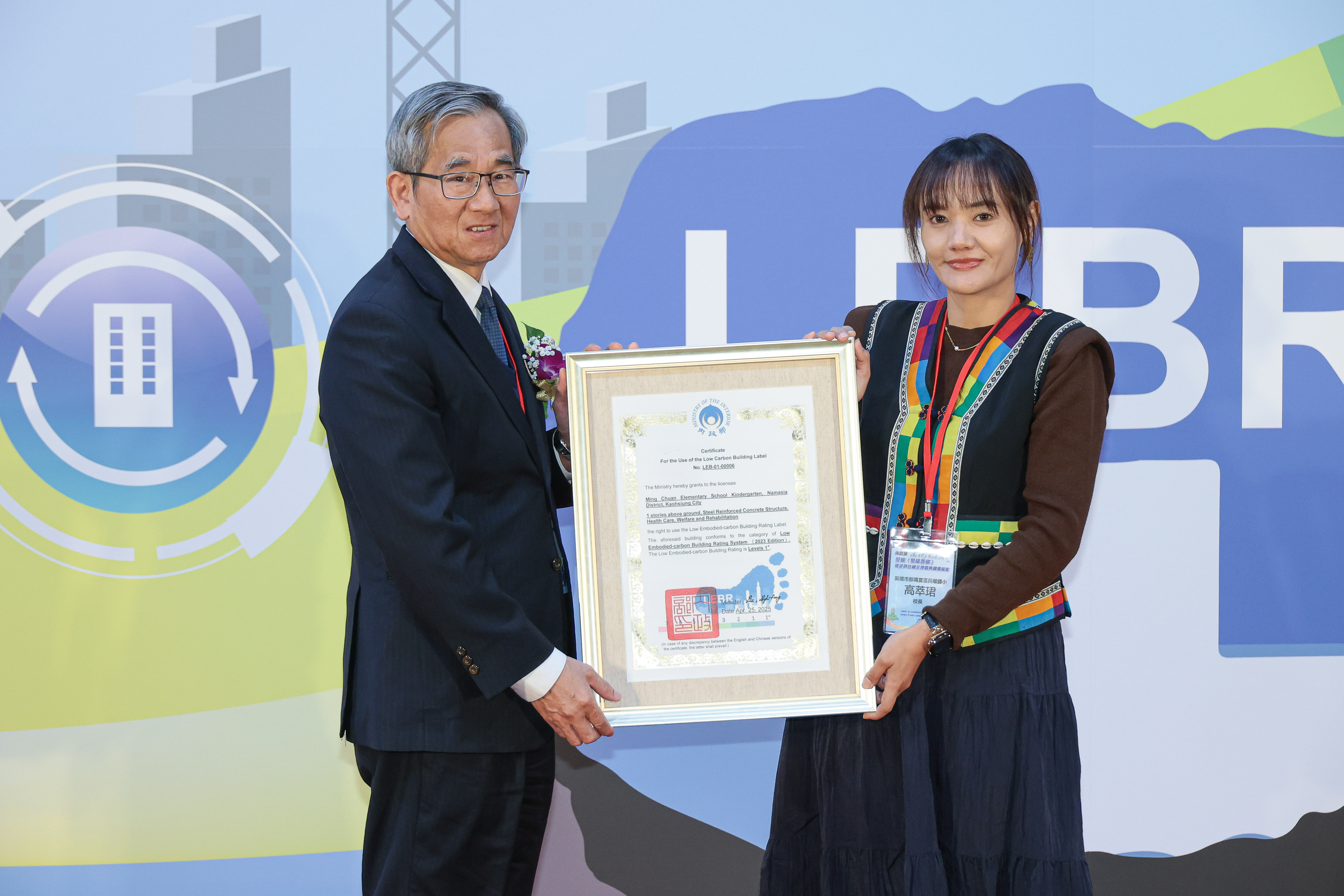 台達基金會2021年捐建的那瑪夏民權國小附設幼兒園獲頒「第1+級低碳建築標示」認證,由內政部建築研究所長王榮進 (左) 頒證予那瑪夏民權國小校長高萃珺 (右)