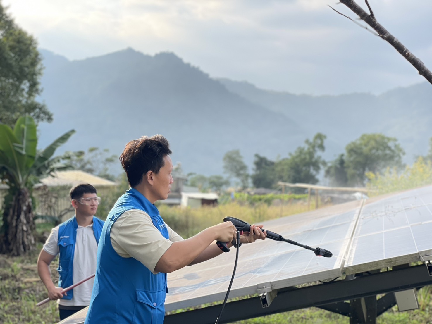基金會志工協助清洗與維護太陽能板,確保再生能源穩定發電