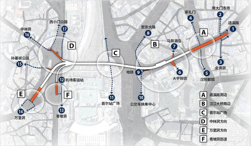 其实当局算过,过往首尔站高架桥每天4.6万辆的汽车通行量中,单纯路过的约占六成,假使高架桥没了,代替道路之一的七牌路交通量将增加27%、西小门路将增加6%,相对的,退溪路将减少16%。对此,市政府增加许多地铁和公交车等公共运输服务,尽量减少开车族的不便,同时诱导民众使用更低碳的人行步道和大众运输。而且别忘了,当行人和游客增多,等于为周围商圈引入更多客源,这点正是逐渐没落的南大门市场渴求的。