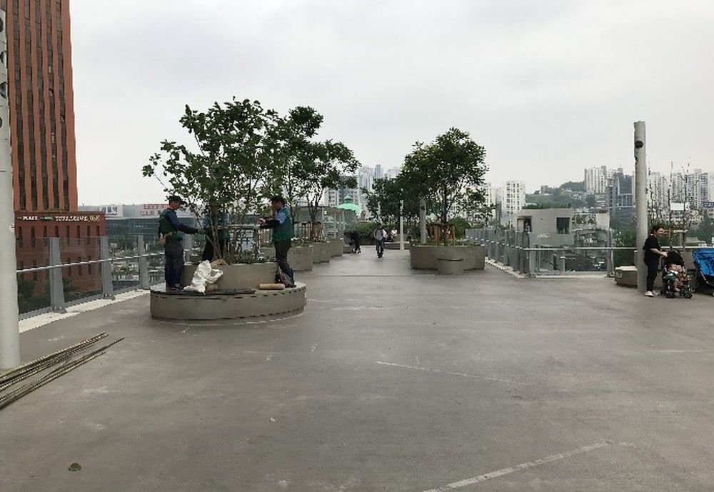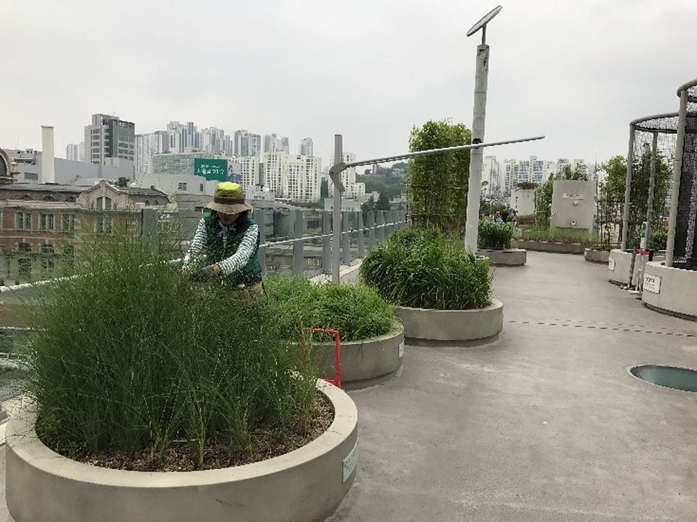 事实上,Seoullo 7017和许多周边的建筑大楼都有通道链接,里头的上班族如果累了(或忍不住跟老板顶嘴),也可以直接从办公室跑出来透透气、散散心,或许也是种另类的纾压管道或工作福利吧!当然,好的公共场所一定需要持续维护,这天走过时,一路上看到许多工作人员正在整理花圃,昨晚一场倾盆大雨刚过,许多设施(甚至有钢琴耶~)都细心地摆上屏蔽,避免被雨淋湿或产生损坏。
