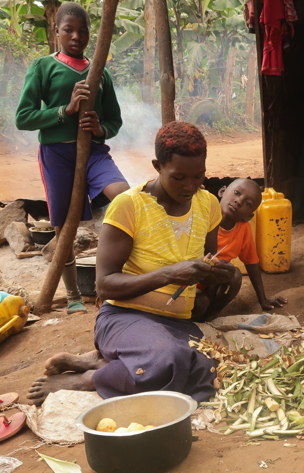 这天的计划,是协助妈妈进行她一整天的活动。Mike的母亲经营餐厅养活一家人。所谓的餐厅其实是路边架起大锅,以一张长凳和一片木板充当餐桌。接着要帮她处理食材,将绿香蕉的外皮削去。”Let her show you how to peel the banana.” Christine担任翻译,让妈妈使用小刀示范。折腾了一阵子后,我看着手中成品,自暴自弃地告诉Christine:”We are KILLING these bananas instead of peeling them...”。
